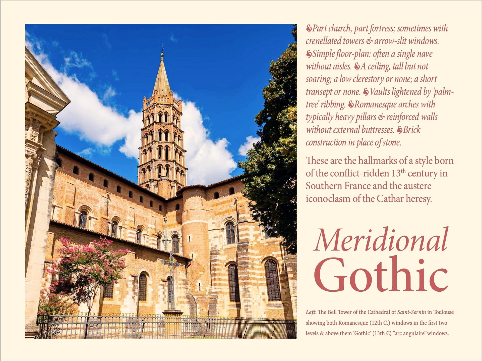 1. "Meridional Gothic" is an album focussed on the Southern Gothic style of basilicas from the 13th and later centuries in France. It's a form of Gothic architecture that reflects the political and religious violence that characterised Southern France during the rise of the (Northern) Capetian dynasty and the suppression of the Albigensian heresy by both a bloody "Crusade" promoted by the Pope and by the notorious, Dominican led, Toulouse-based Inquisition.