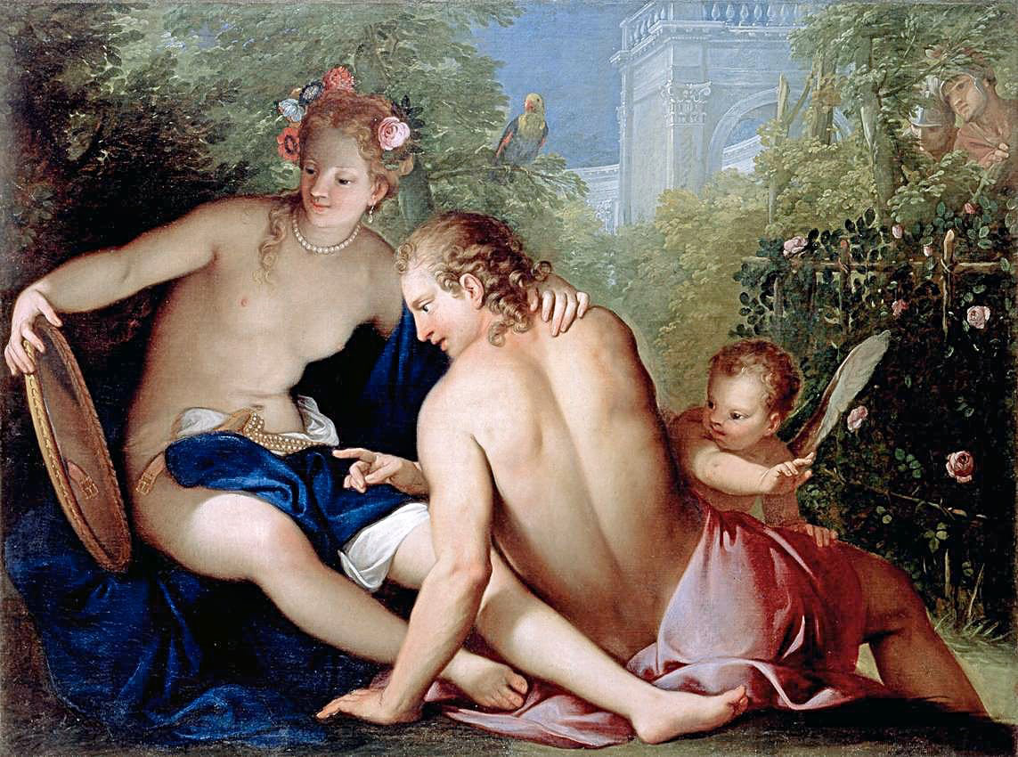 The image is Lazzarini's "Rinaldo & Armida": In Tasso's epic "Jerusalem Delivered", Rinaldo is a fierce, honorable and handsome warrior. Armida has been sent to stop the Christians from completing their mission and is about to murder the sleeping soldier, but instead she falls in love. She creates an enchanted garden where she holds him a lovesick prisoner (here shown as bewitched by his own image). His companions Carlo and Ubaldo (visible in the bushes, top-right) rescue Rinaldo by holding a diamond shield (lo scudo adamantino) to Rinaldo's face so that he sees himself in his weakened state, thus breaking Armida's spell.